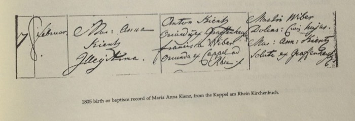 Birth or Baptismal Record of Maria Anna Kienz 1805